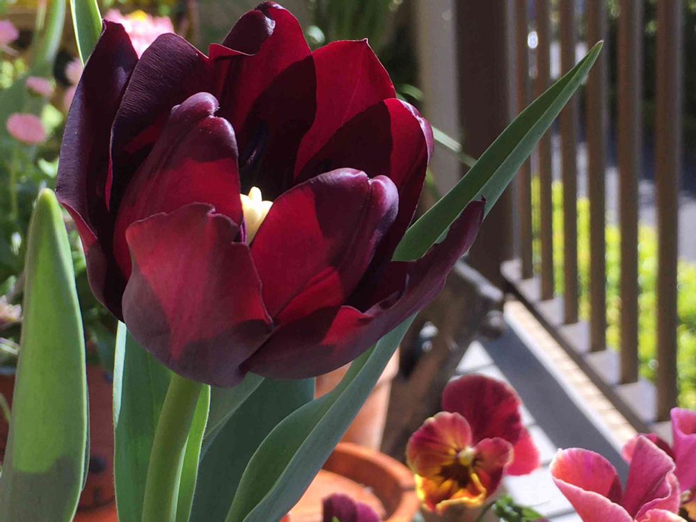 チョコレート🍫寄せ植えの中のチョコレート色のチューリップ咲きました✨