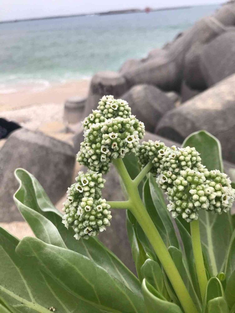 海岸に生えているモンパノキ。マジで砂浜に生えてる。おそらく花は終わりで、実になりかけている。キモい。実はもっとキモい。笑