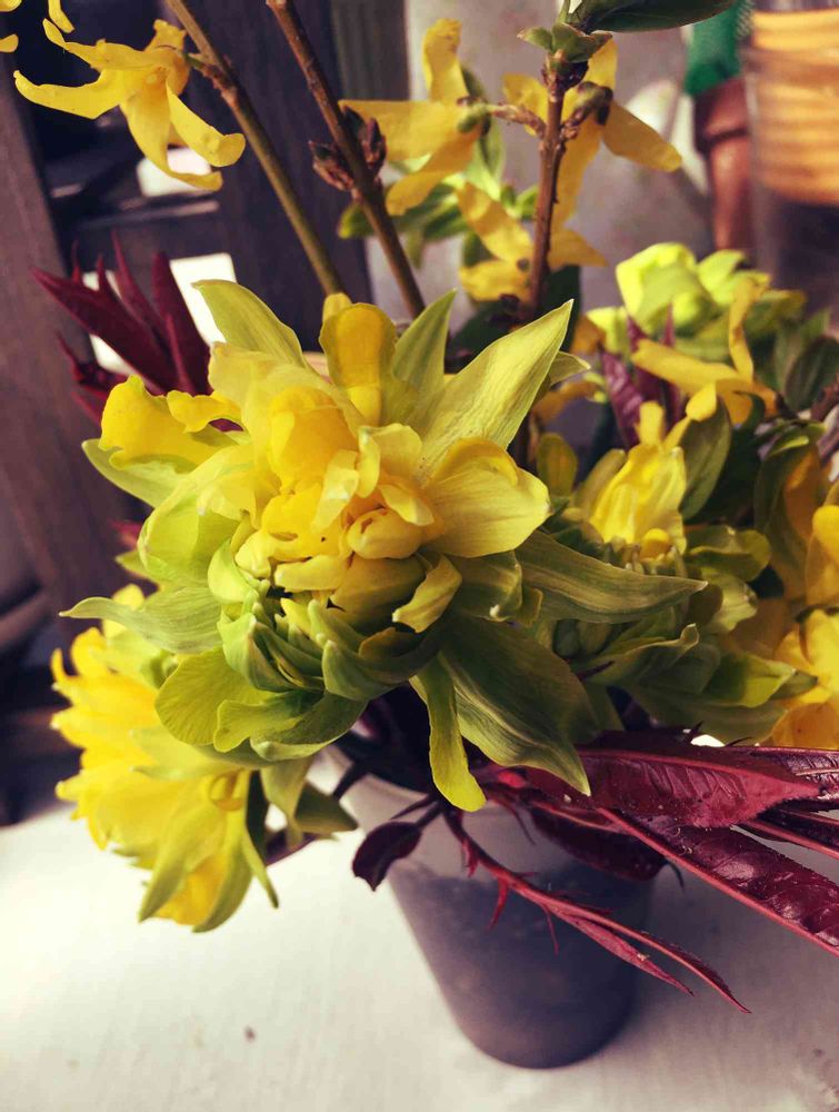 赤いのは生垣の新芽。大きな花は名前は分からない。小さな黄色い花は連翹と言うそうです