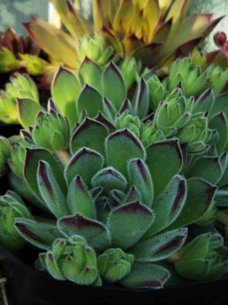 鮮やかなグリーンと 縁のパープルが魅力の センペルビウム・ピレネカムさんと 夕日を浴びて ゴールドに輝いてる アローさん😻💚💜💛