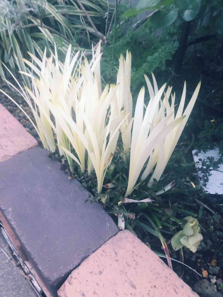 葉がほとんど真っ白なんですが、もうしばらくすると、垂れ下がって普通のムスカリの形になりますよ〜。