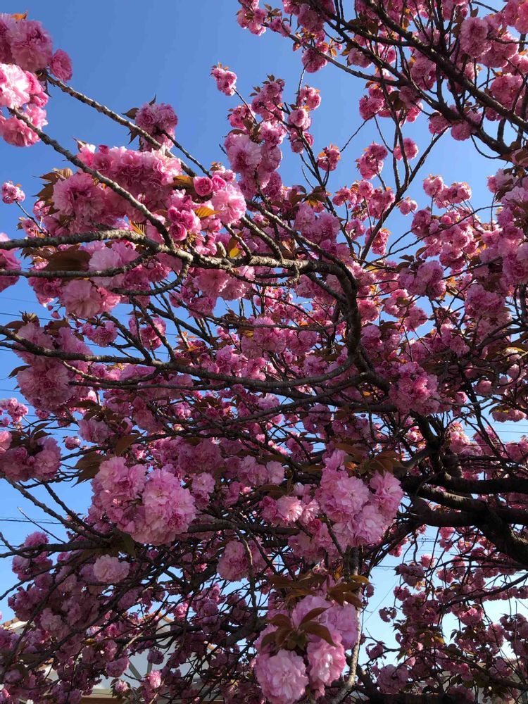 青い空に映えて咲き誇る八重桜🌸の華やぎ素敵ですね〜