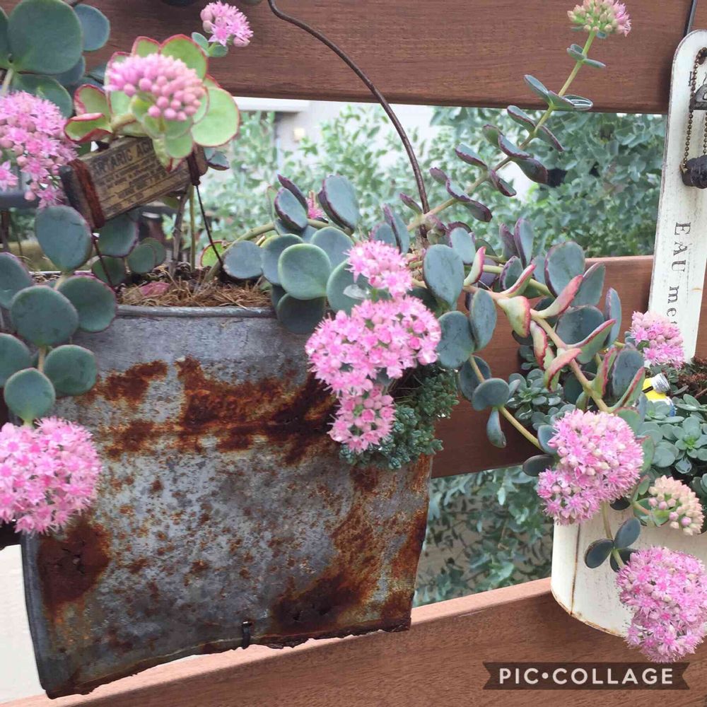 肉厚なまるい葉にピンクのお花❤なんてかわいいのぉ~~(◍•ᴗ•◍)♡ ✧*。サビサビのリメ缶との合わせ方が上手♡とっても素敵です♪'゚。.*#:・'゚.:*♪: