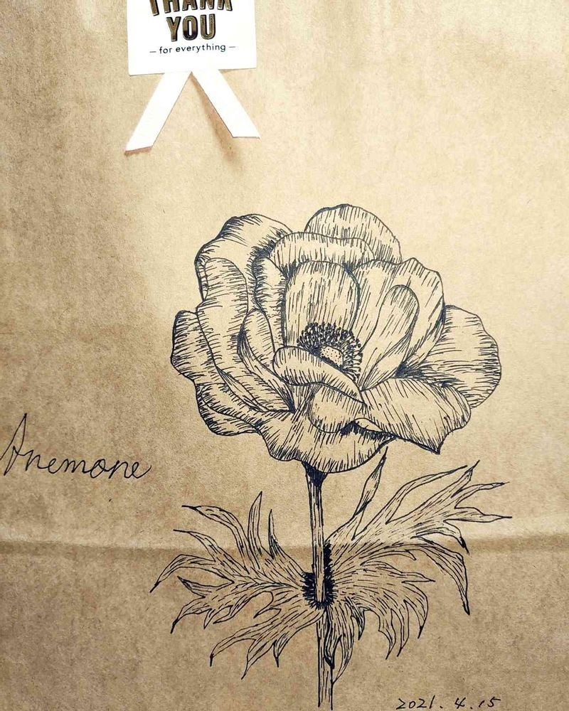 知人から就職のお祝いにお手紙とプレゼント🎁をいただいたので、お礼をしようと思いました。プレゼントは用意できたのですが、袋が殺風景な紙袋しか無かったので私の好きな『アネモネ』のイラストをボールペン描くことにしました。*॰ॱ✍