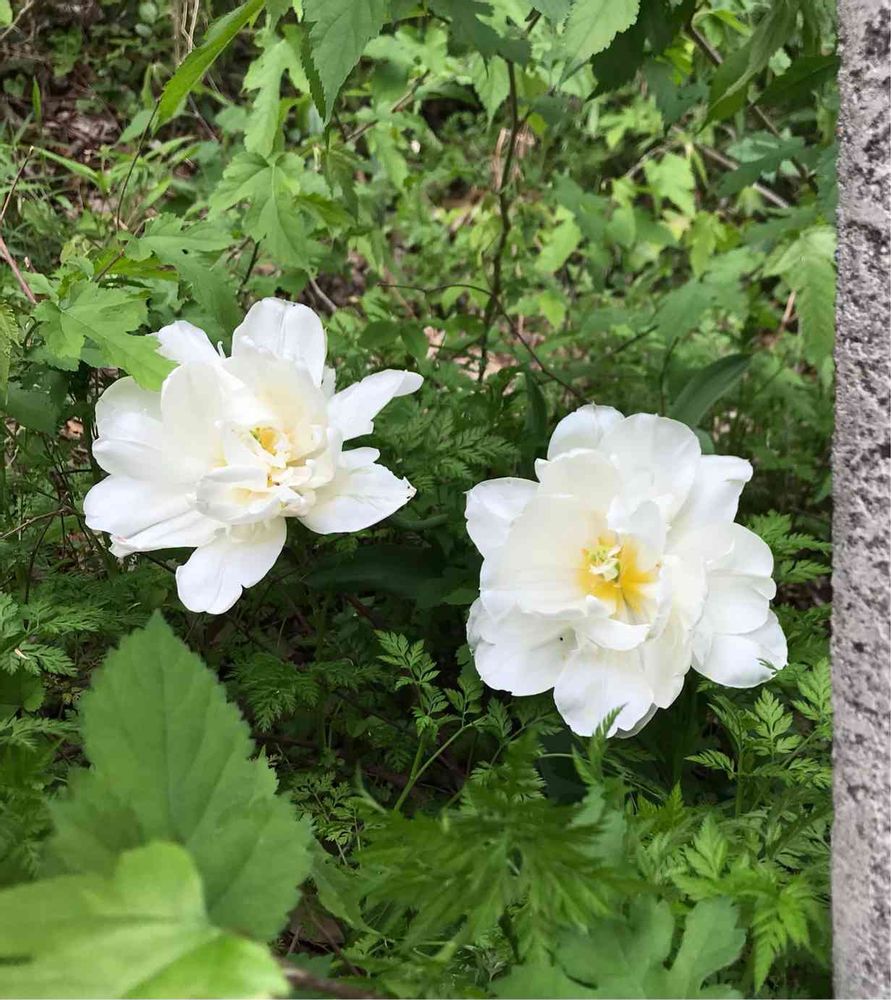 コンクリートの柵の向こうの 草むらの中から真っ白な花が2輪 朝のご挨拶を❣️