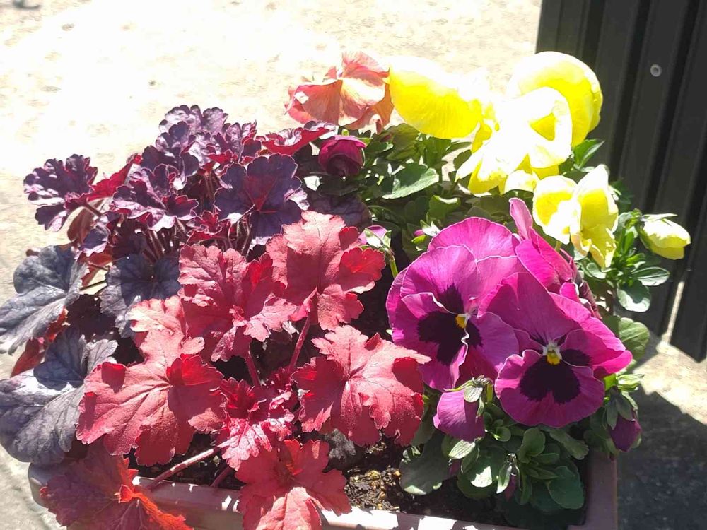 やっと本気を出してきたパンジーとヒューケラのどっしり系コンビ💜❤️💛