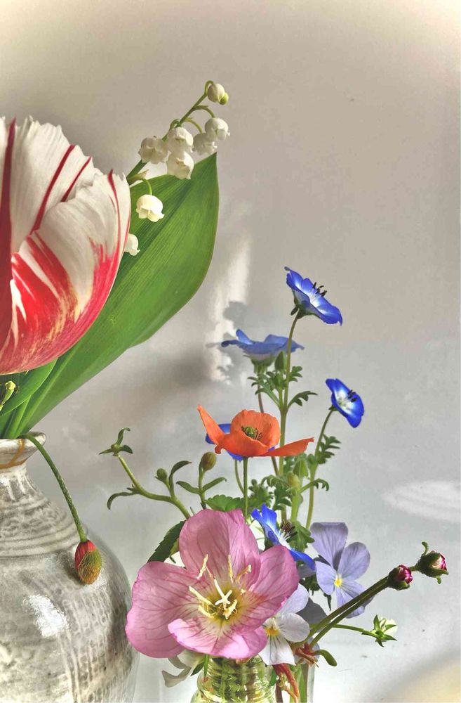 みんな終わり間近だったり徒長しすぎて剪定した所だったり折っちゃったりのはんぱ物…ピンクとオレンジは道端で蕾を持って帰りましたよ。長持ちしないけど美しいし、買ったお花より華奢で繊細で動きがあり生き物だなぁって感じで好きですよ。チューリップは切って家に入れて挿したら直ぐ下を向いてしまったけど朝になったらピンとしていましたよ。このちっこいリビングストンデージー咲いたらカワユイ✨🐵💕✨