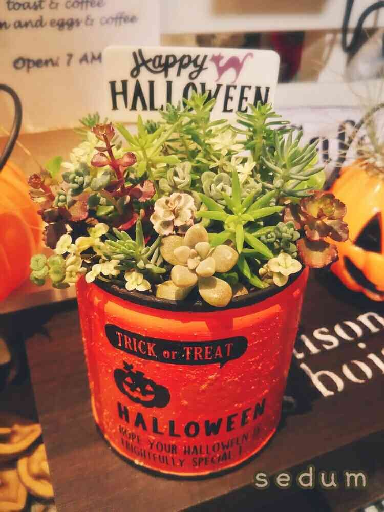 ハロウィン🎃リメ缶作ってセダムをチマチマ植えたものです☺