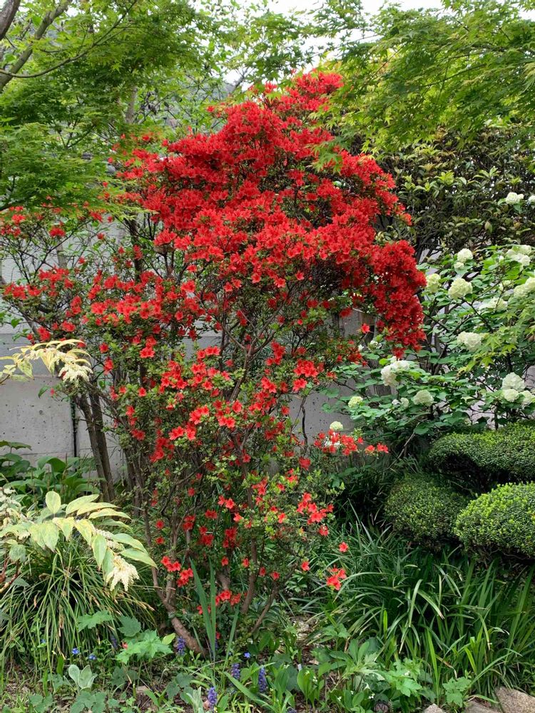 霧島ツツジが満開です。となりのオオデマリの白と対照的です。