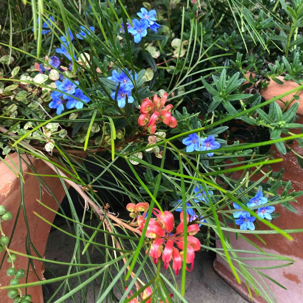 my garden 大輪系グレビレアと西物バンクシアが好きです♪ 他ネイティブプランツがチラホラ 地植えブーゲンビリアはずっーと咲いていてリゾート気分🏝 トゲ無し美アロエ 系を少々 その他諸々 葉も綺麗な植物が好きで樹形も仕立てていきたい♡