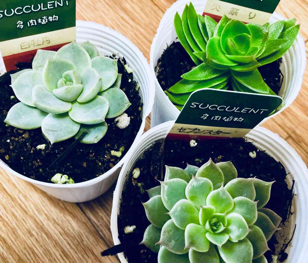 鉢植え整理しようと思ってたのに、よく行く花屋さんに多肉ちゃんが増えていて、買ってしまった、一つ120円についフラフラと。