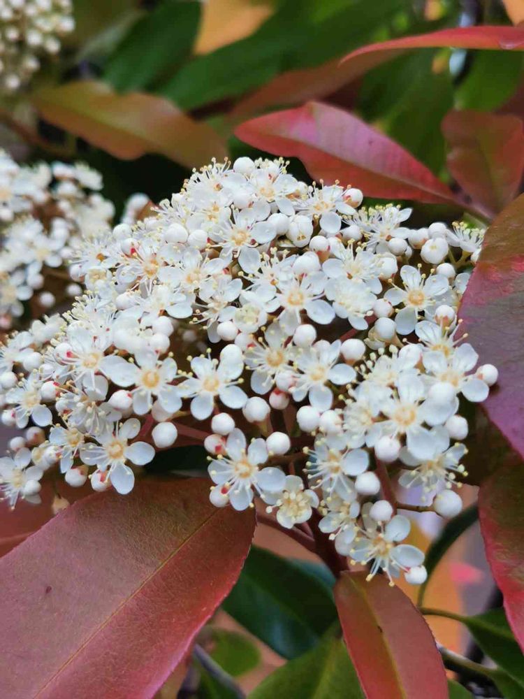 最初、レッドロビンに花が咲いてると思い、近づいてよく見たら、かんざしのような素敵な花でした。💘