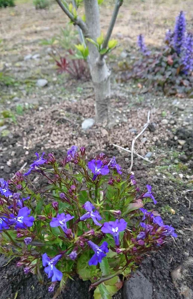 ムクゲの木の足元に ロベリア ルピナス アジュガさん…