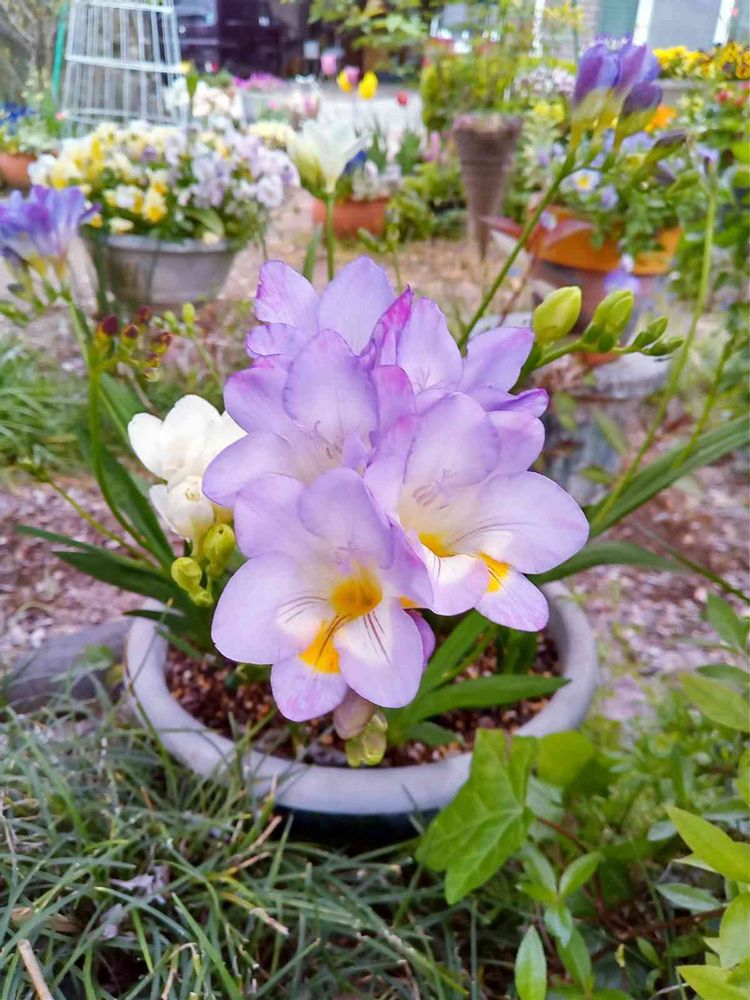 朝採れ野菜を買いに行った帰り道、通り道のお宅のお庭に、鉢植えの、💜のフリージアが綺麗でした。