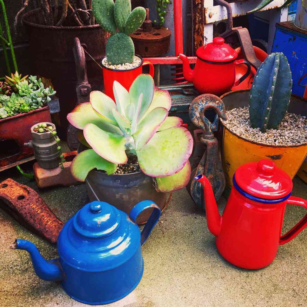ホーローの赤色や青色がお庭のアクセントになって素敵ですね✨✨