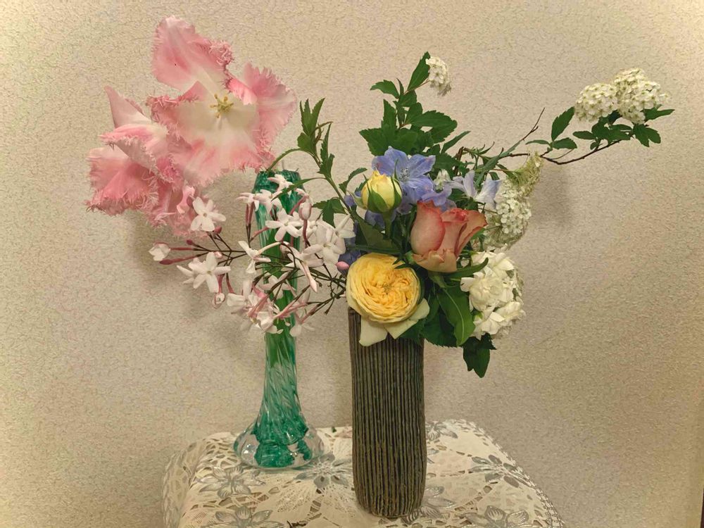 もう流石にサヨナラと思ったのですが、たまたま娘から小さなお花の差し入れがありましたので、昨日雨前にカットした我が家のお花達と一緒に✨🎶