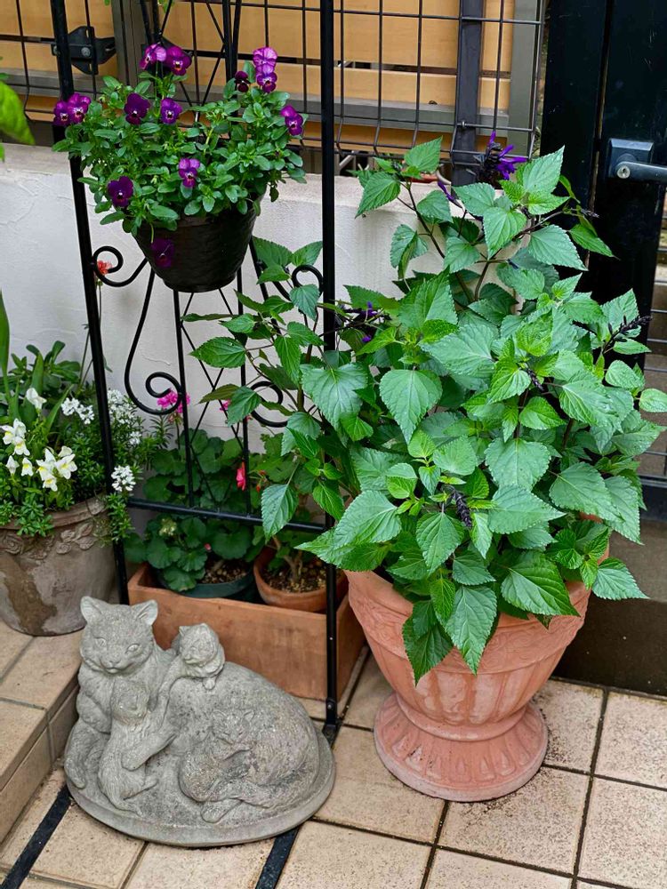 冬越しして、植え替えしてから1ヶ月たったスーパーサルビアロックンロールディープパープル。玄関先の壁際で軒下の日陰に置いていましたが、枝ぶりもよく、少しずつ開花しています😆💖