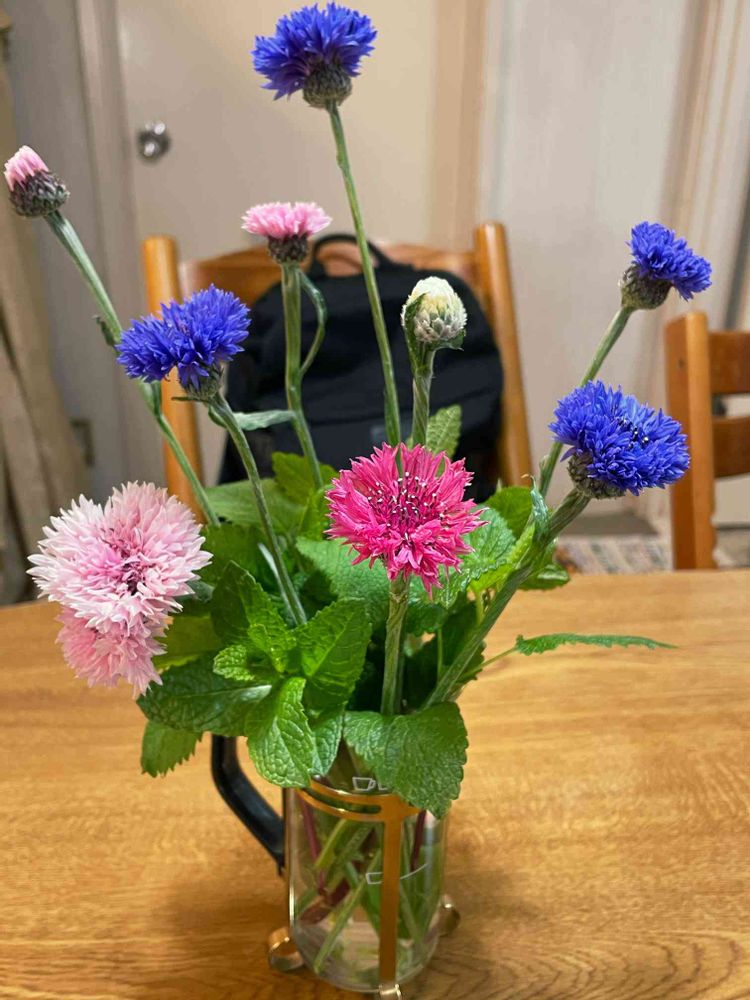 畑から摘んできたヤグルマギクと庭のあちこちに生えてきたレモンバーム、ミントを合わせて、爽やかな香りを➕🌱