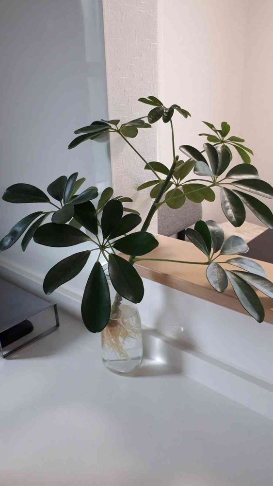 実家に植えてあるシュフレラをカットして水にさしておいたら根っこがぐんぐん伸びてすごいことに👏