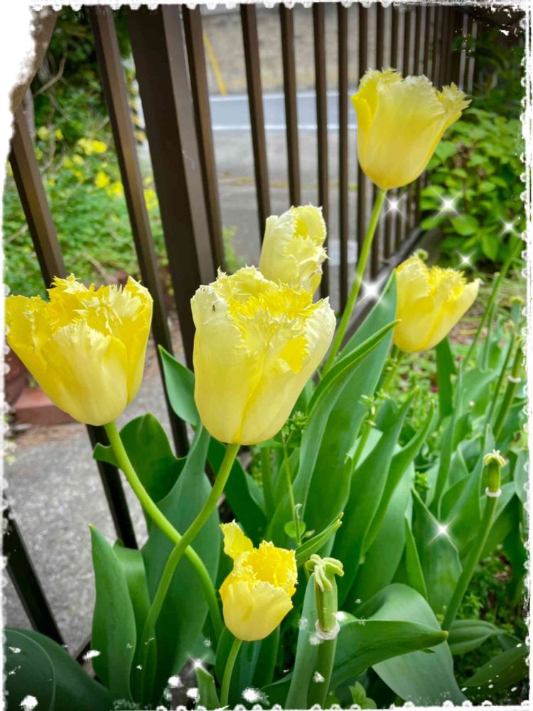 一緒に植えたチューリップ🌷が散りかけの頃、最後に💛🌷が出てきて…