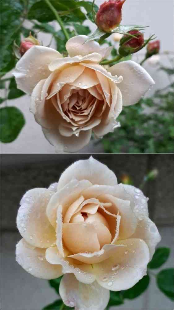 雨の重さでバラはみんな下向きになってしまいますが、それも趣があって良しとしたいです😊