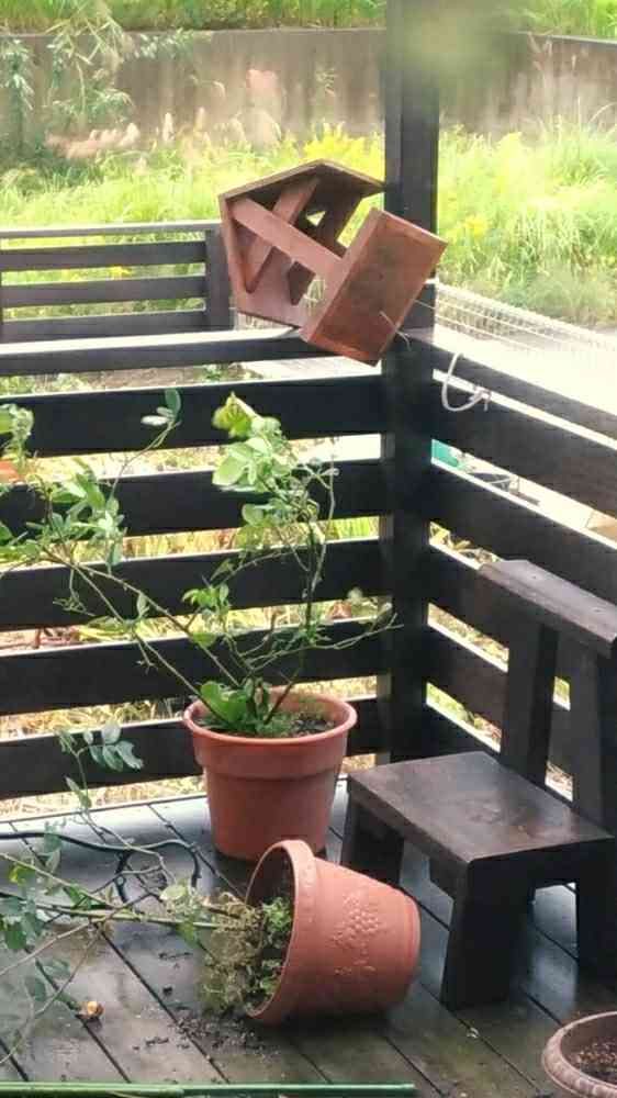 画面の手前には根こそぎ飛ばされた薔薇の鉢が・・(^_^;)