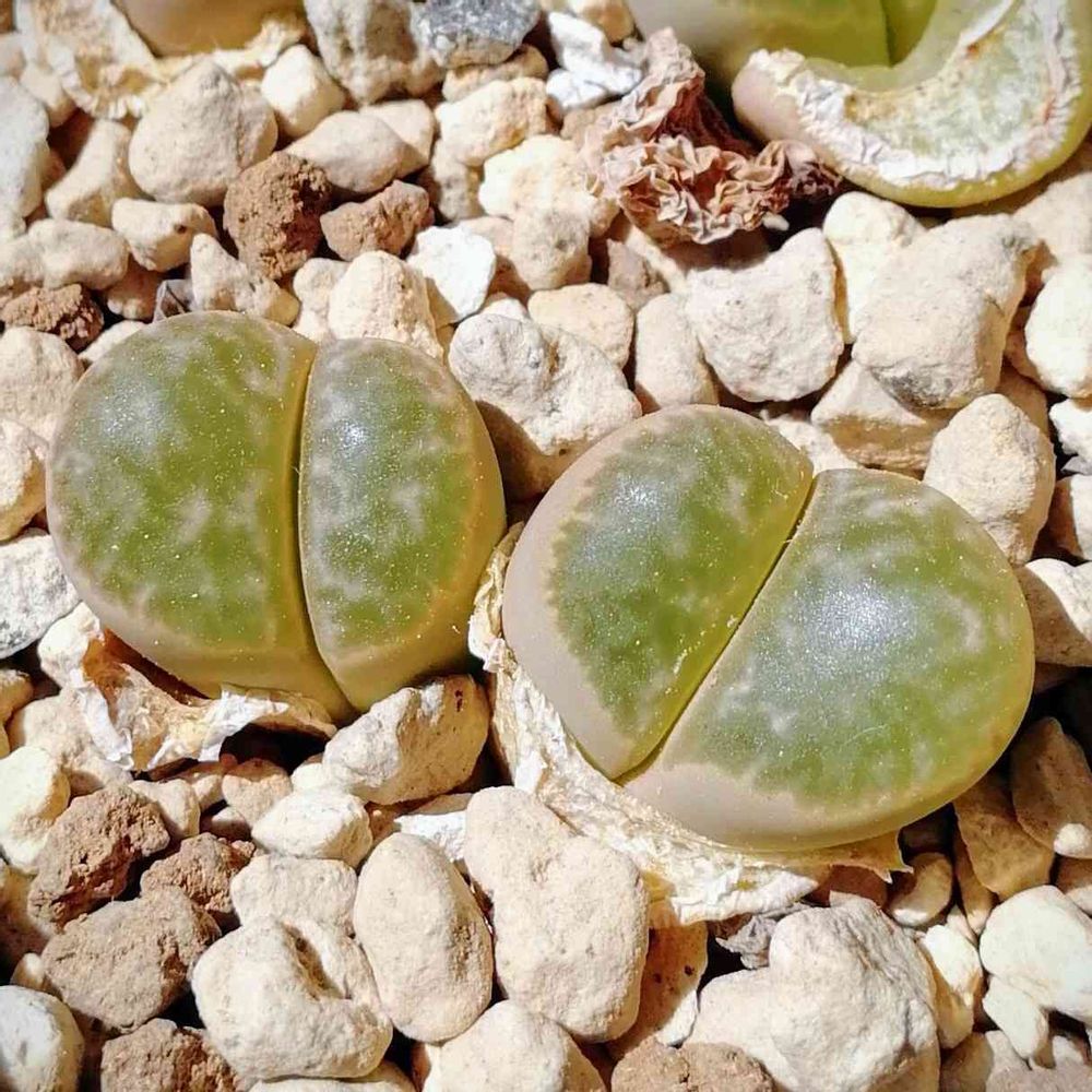 ベラケッティ、アンナローザからの緑系つながりで、2年前にオリーブ玉(Lithops olivacea)の名前で手に入れたリトープスです。コールナンバーは付いていません。