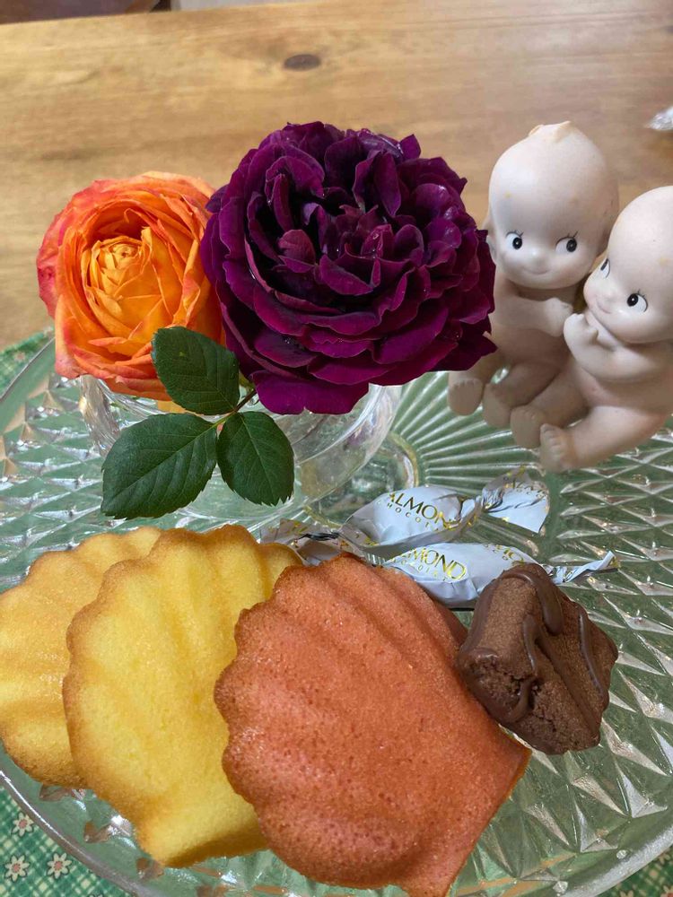ベビーロマンティカとスヴニールドクトルジャメインのブルーイングが少し進んだ薔薇と職場の方の移動で頂いたお菓子と一緒に。