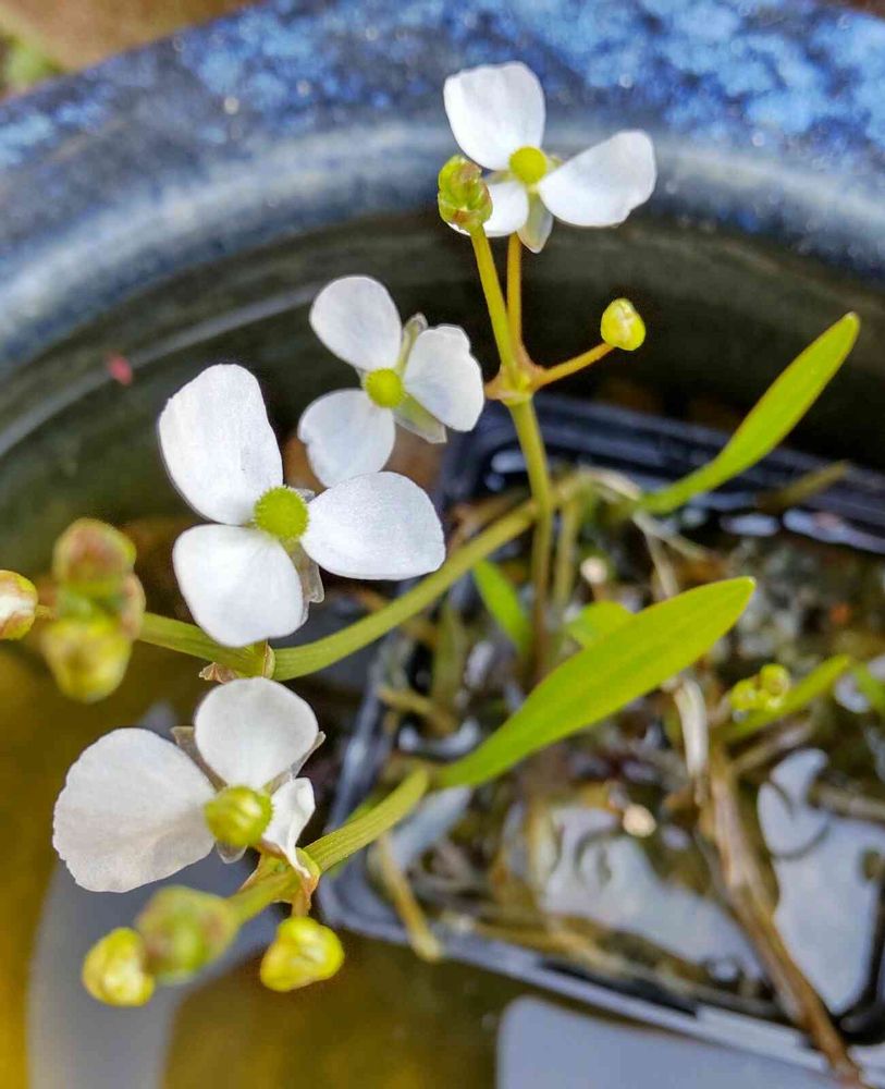 この「ナガバオモダカ」は買うと案外高額ですが、とてもよく増えます‼️寒さにも暑さにもとても強く、冬に無くなった葉も春には伸びてきて、白い可憐な花を咲かせます。私もかなり株分けをし、メダカ愛好家の人に多数あげるのですが、棄てるのもかなり出てきます。水生植物は花期は短いのですが、ナガバオモダカは何回か咲いてくれます。楽しいですね。(笑)
