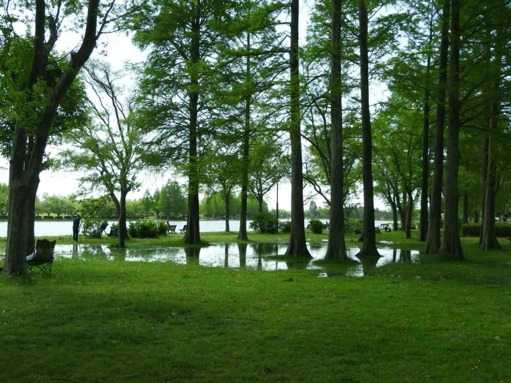 昨日の☔で、水辺の近くのメタセコイアの森では、水溜りが池の様に成りました。昨日の、