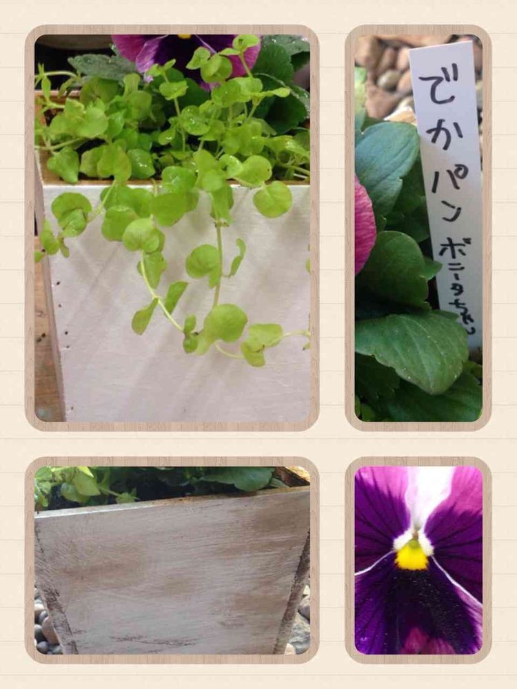 木の鉢をアンティーク調に仕上げての寄せ植えです。