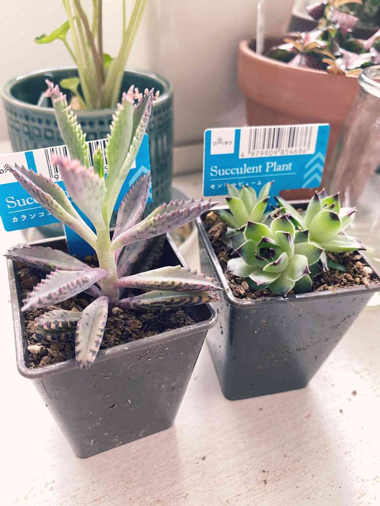 カランコエは葉色が素敵で購入したのですが…そうだ、この子は葉っぱに子株がつくやつ…!(忘れてた)