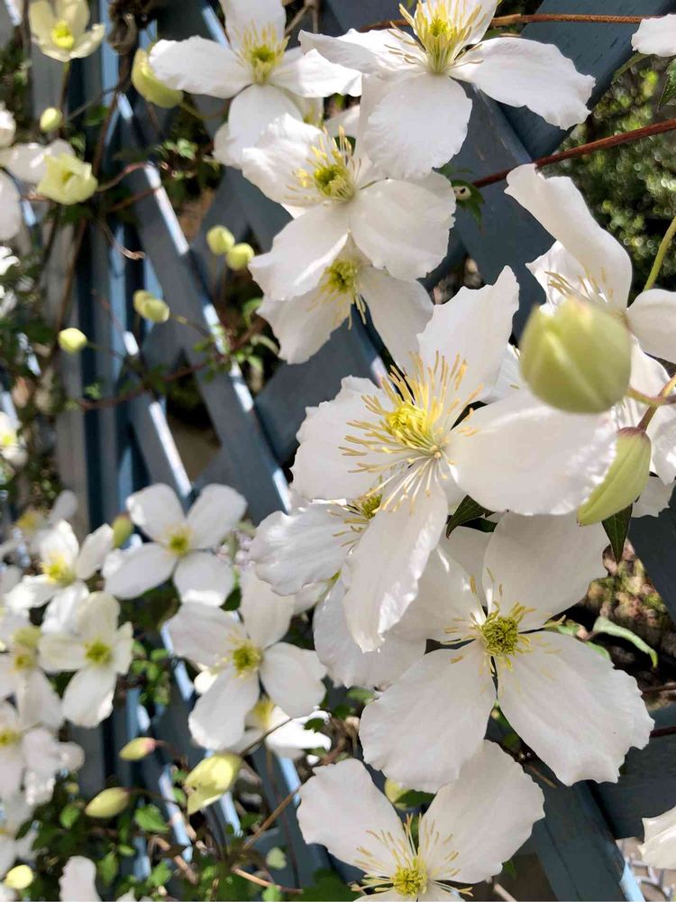 クレマチス モンタナ スノーフレークが咲きました❣️ラティスの隙間から、☀️の光が当たってキラキラ✨✨