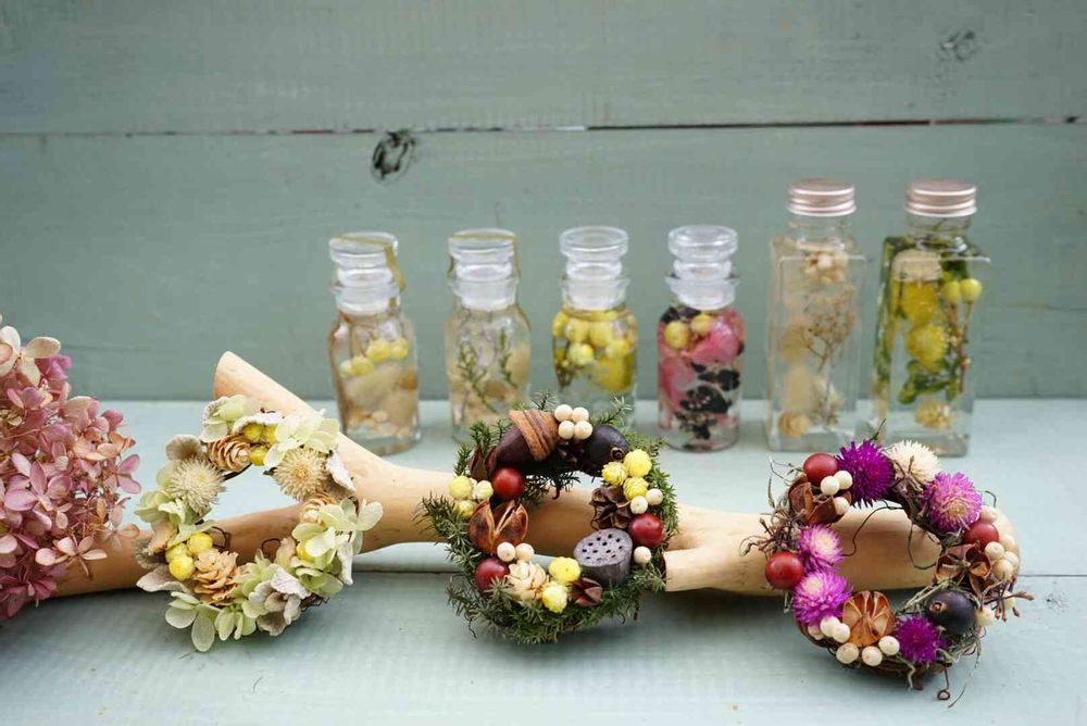 ガラス瓶の中にドライフラワーを専用オイルで閉じ込め植物標本を作ります。