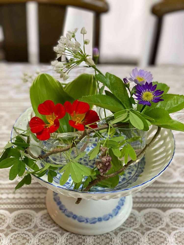 実家の裏庭のあけびのツルと、庭の花を摘んでグラスに生けました。癒されます♪
