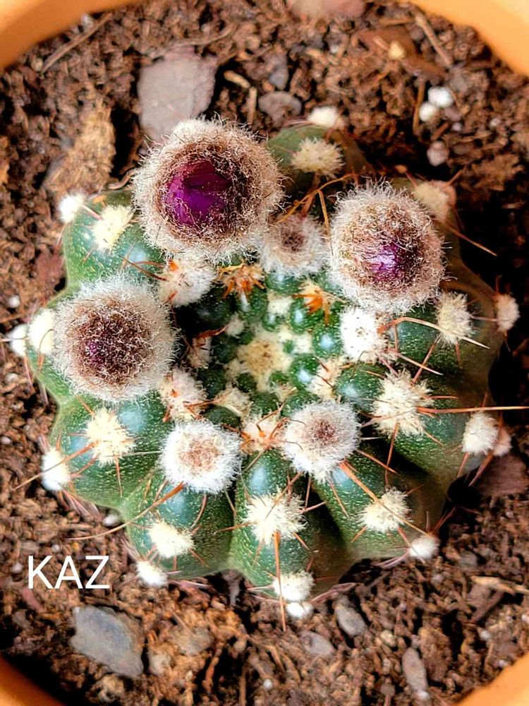 この🌵は棘の付け根の白い綿毛から、蕾がモコモコ成長して...これはたぶん紫かピンクの花でしょうか💜花芽が異様に長かったり、面白いですよね多肉のお花ってイメージ出来ないお花が(𖧷>艸<)🎶