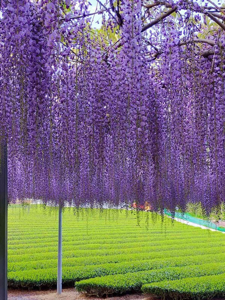 お茶のグリーンと、藤の紫色がとてもきれいです。素敵な風景、目の前で見てみたいな~(∩˘ω˘∩ )♡