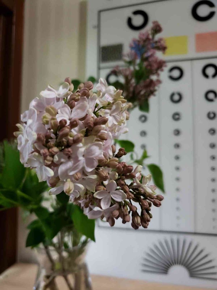 駅で花農家の特別販売があり ライラック2本とエリンジウムとバブリア2本とレースフラワー2本で1290円。ライラックと写真ではよく見えないエリンジウムで玄関に初夏が来た✨バックには視力検査板をそえて、、、
