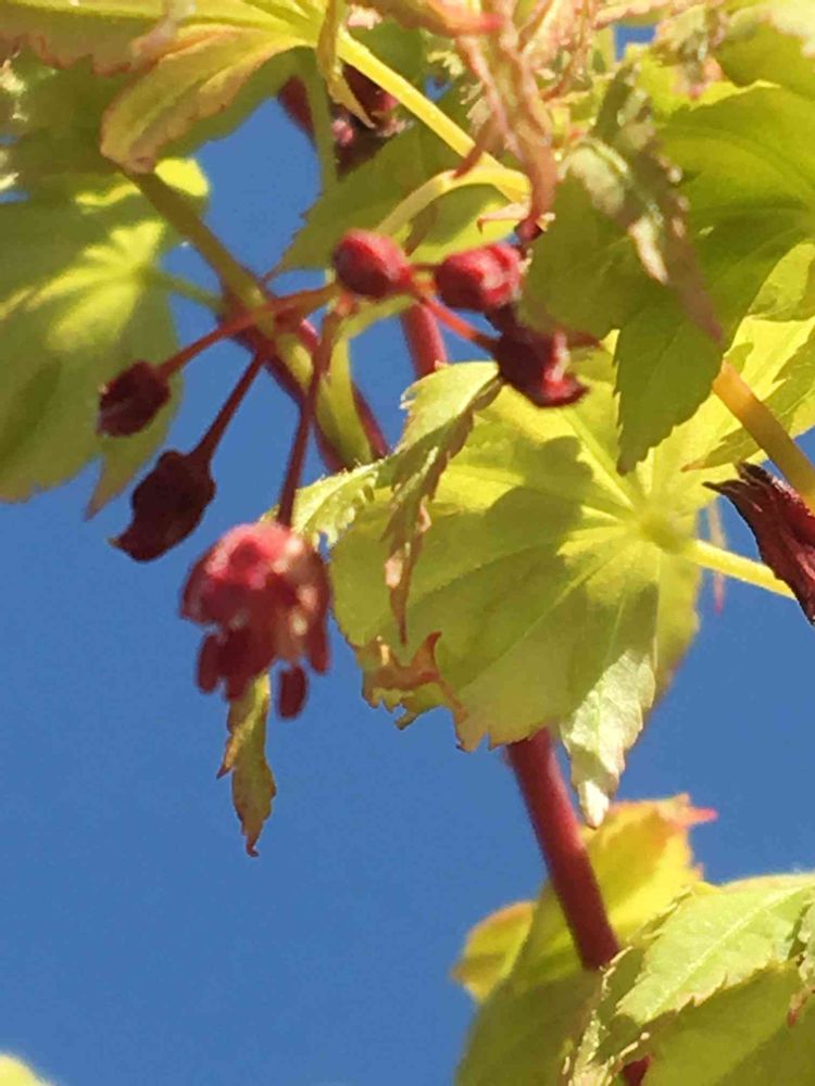紅いお花を付けた楓(珊瑚閣)。幹と葉のコントラストが一年中 楽しめます。