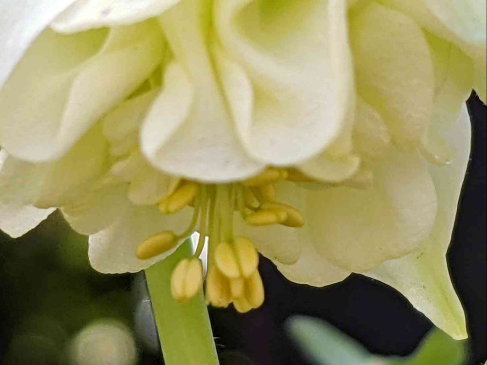 自治会から配布の寄植。楽しみにしていたオダマキが咲いて来ました。白と思いきや、写すと余計にクリーム色です。柔らかいフォルムがきれいです。🤍
