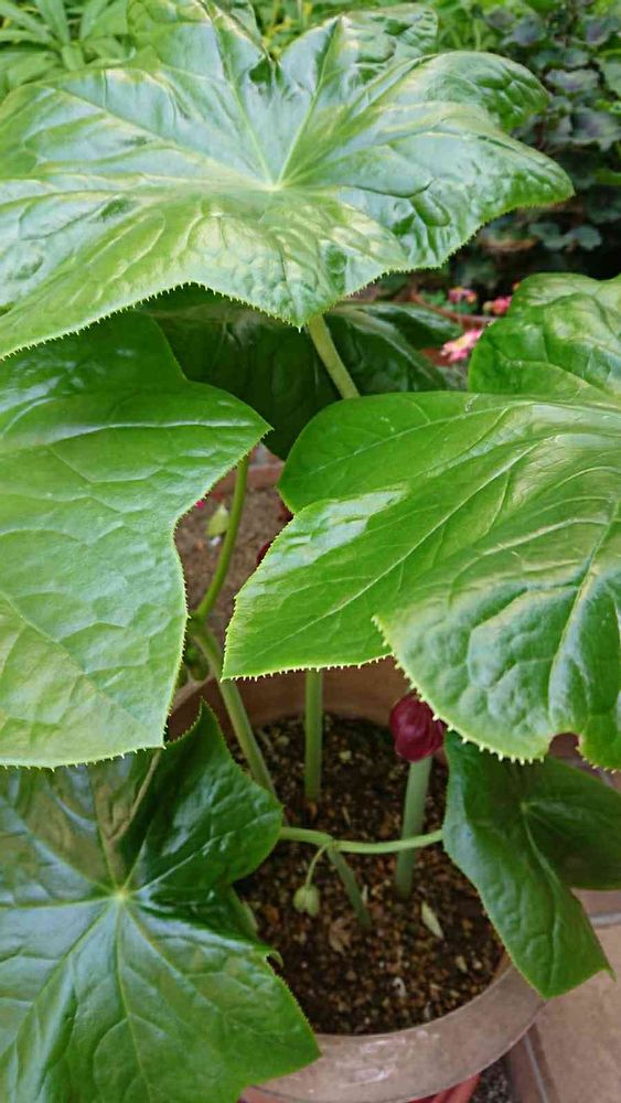 大きな葉で下の方にすずらんの様な赤ぽい丸い花がいくつも下向いて咲いています、群馬県で買って、山の花かもと思います、