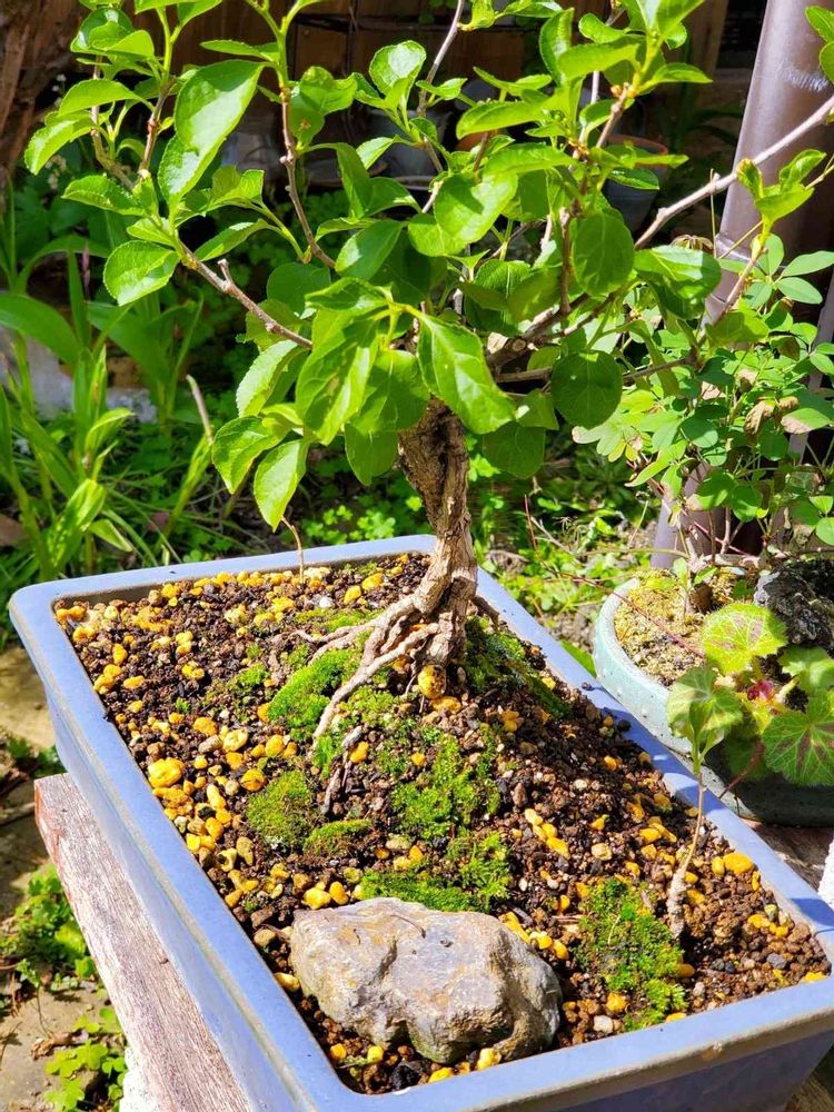 今は土を盛り上げて苔を張っていますが、細い根が鉢の下に広がったら、石を少しずつ露出させて行くと、石を抱き込んだ盆栽になるわけですが…