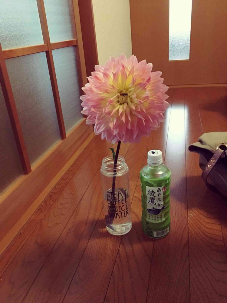 すてきなダリアを引越し中にいただいた。知性を感じるピンク🌸花瓶がどの段ボールかわからないので応急処置で。