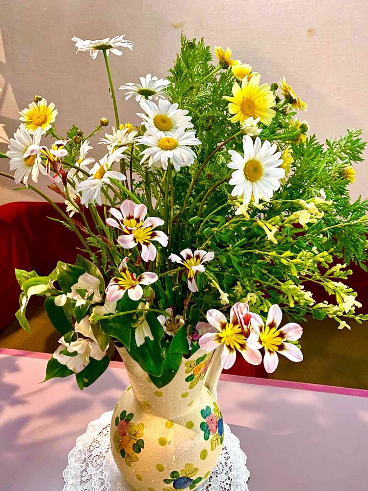 春菊の葉をちょっと空かして左に生けると可愛いブーケになりますね。🙋💕