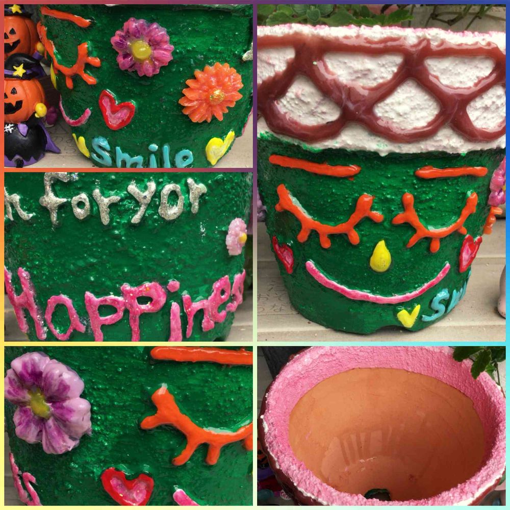 こんな可愛いリメ鉢なので きっと大喜びですよ(*^^*) グルーガンとアクリル絵の具やマニキュアなんですねぇ〜❣️私も 作って見たいなぁ♪