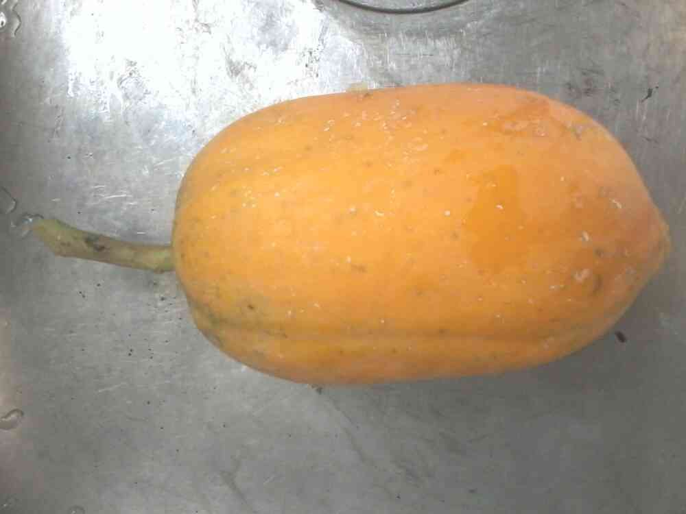 今朝の収穫です。採れたてのパパイヤは茎から粘液が出ますので、30分くらいは流し台で放置です。