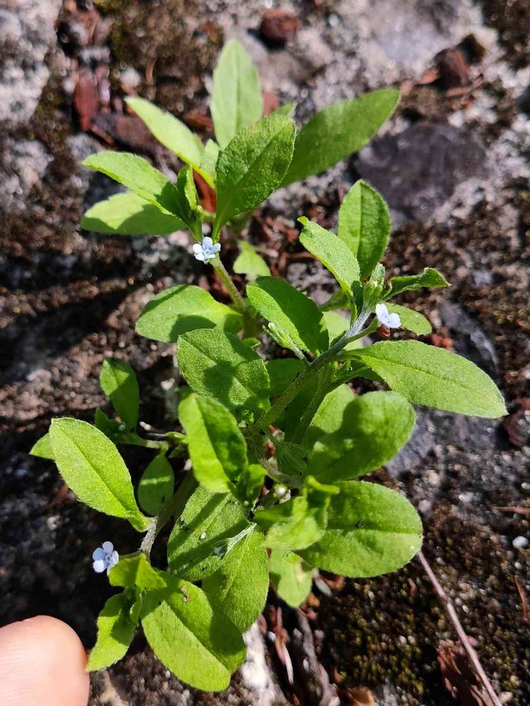 ようやく見つけたハナイバナ。キュウリグサよりこっちのが全体的にがっちりしていて毛が生えてる。花もキュウリグサよりさらに小さくキュウリグサに比べて青みも薄い。キュウリグサは真ん中の柄が黄色なのに対し、真ん中の柄も青いのが特徴だそうで。