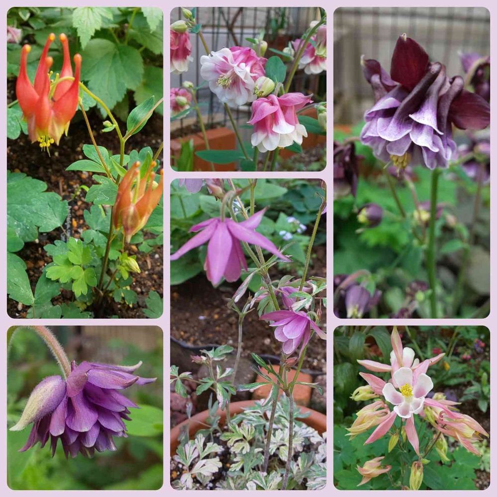 カナダオダマキ リトルランタン(左上)とブルーバロー(左下)が開花してオダマキが6種類咲いています。