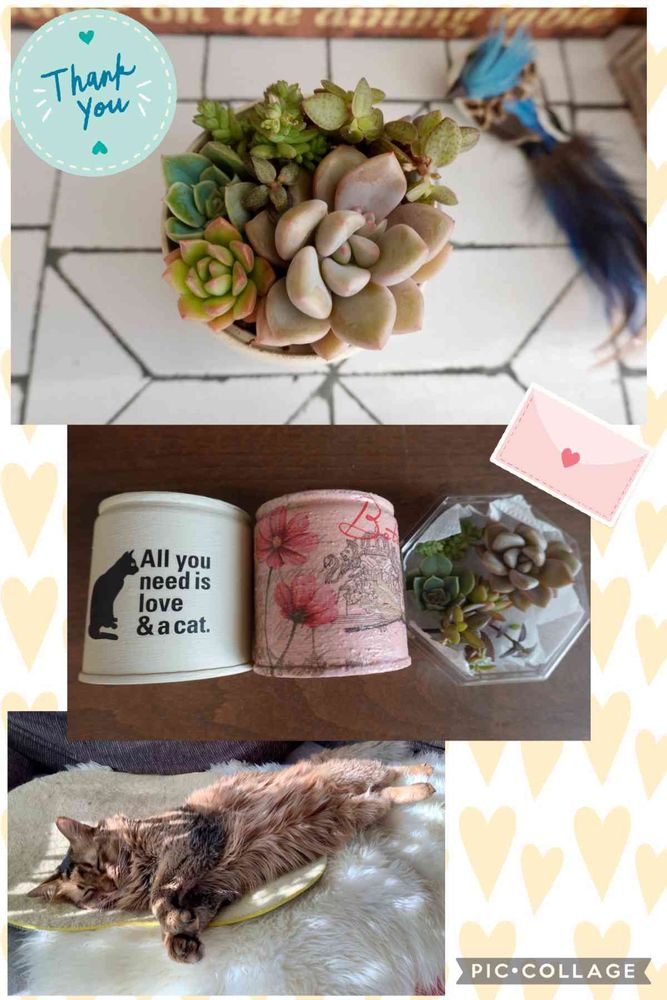 猫ちゃんのリメイク缶と花のリメイク缶、可愛い多肉苗、他にお菓子もいただいています😃