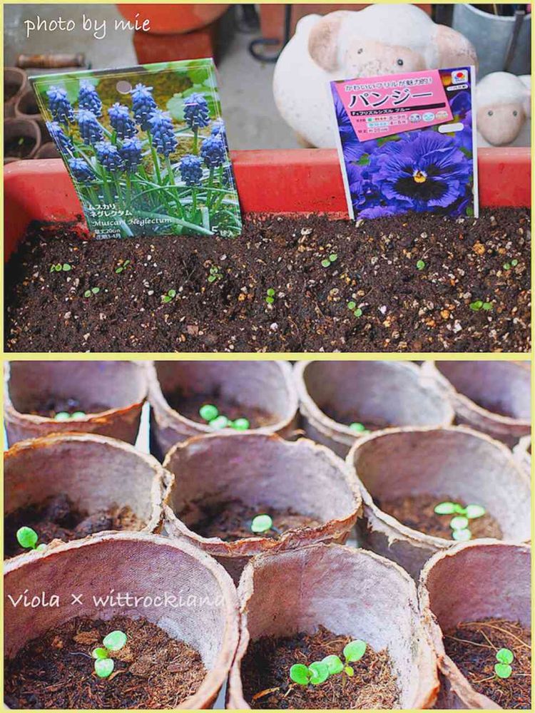 今日はフリル咲きパンジーの種を蒔いてから約2カ月経ち🌱が出ていたのでムスカリの球根と一緒に